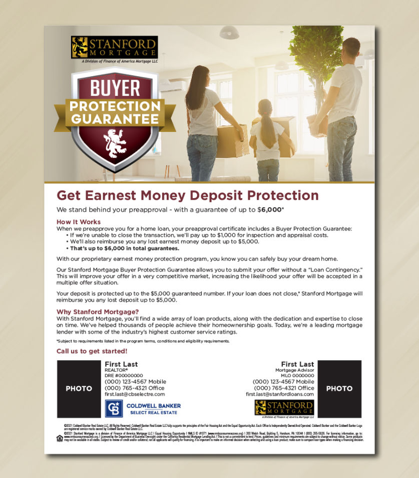 The Stanford Mortgage Buyer Protection Guarantee allows your client to submit their offer without a "Loan Contingency." This will improve their offer in a very competitive market, increase the likelihood of their offer will be accepted in a multiple offer situation.